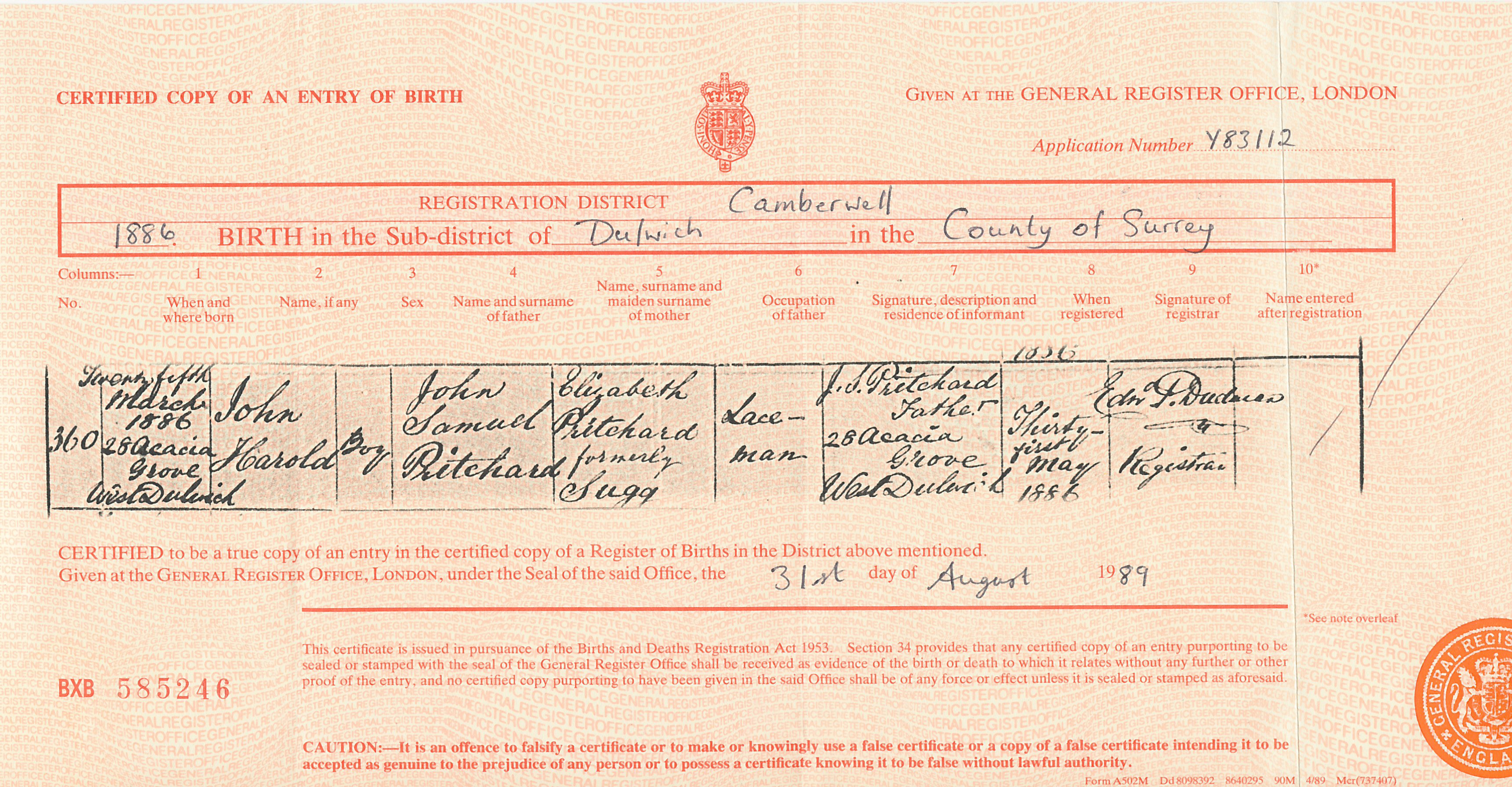 May 31st 1886 His birth was Birth registered on this date JOHN HAROLD PRITCHARD