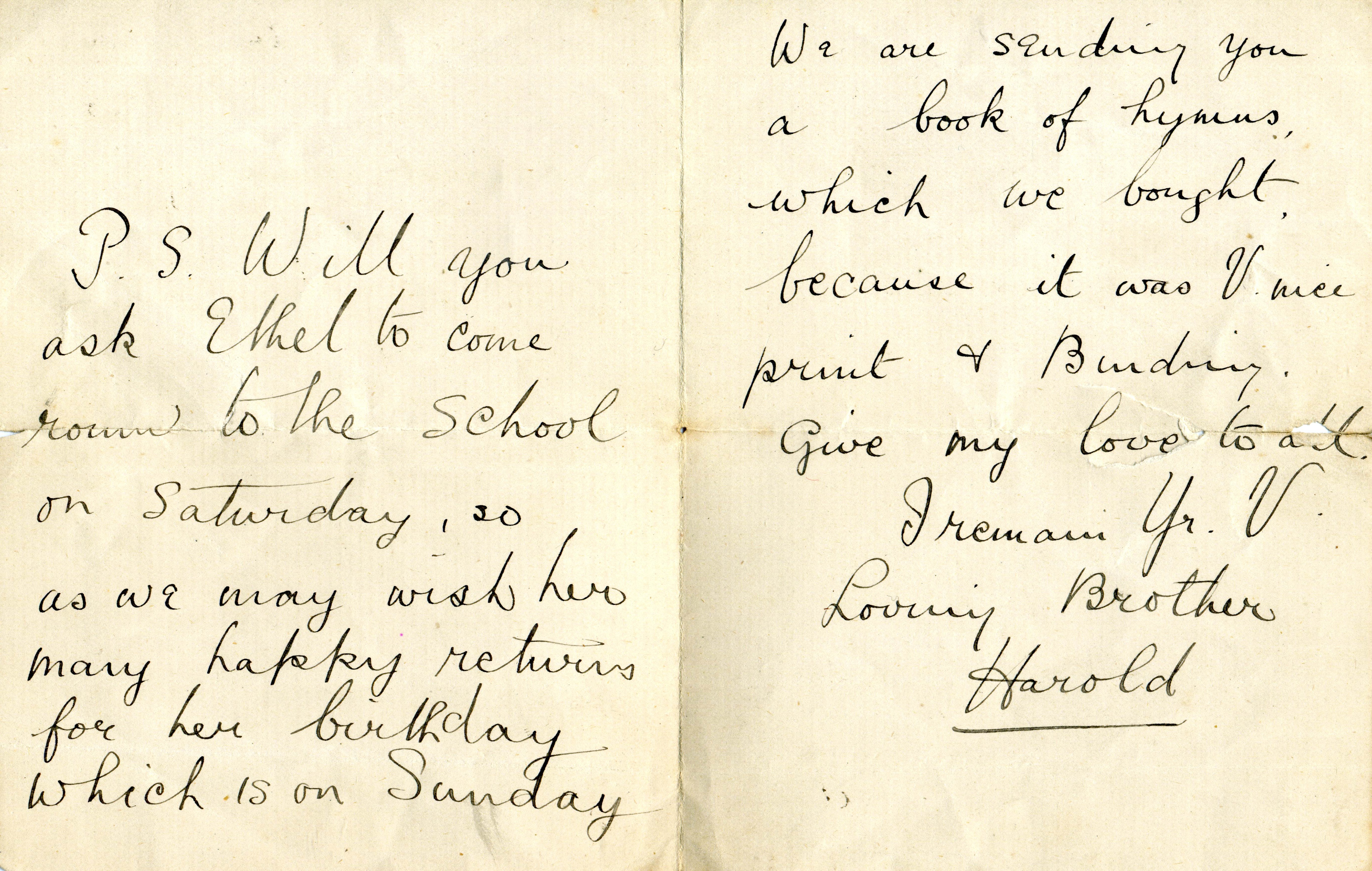 1902 was a busy year for John. He and Ernest were selected to sing at the Coronation of King Edward VII. Queen Victoria had died in 1901 and for many people, the Prince was a welcome breath of fresh air. The country entered a golden period of well being and life felt good. In February we have a tantalising glimpse of John’s personality at the age of 14 when he wrote a letter to his sister, my nan, for her impending birthday. There is much speculation in the family as to what he means by underlining the word real, hinting perhaps at a less than happy home life for his sister. He also signs the letter as Harold.