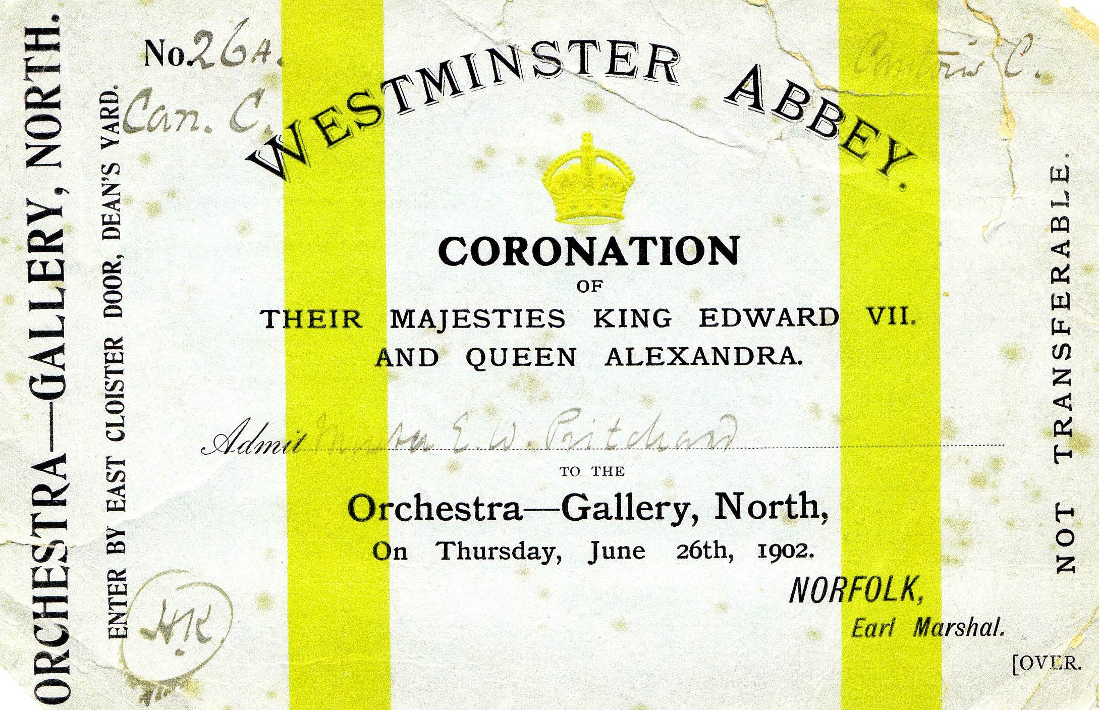 The ceremony was set for June 26th 1902 and tickets were issued to all the participants. Although John’s is lost, the family have that of Ernest.