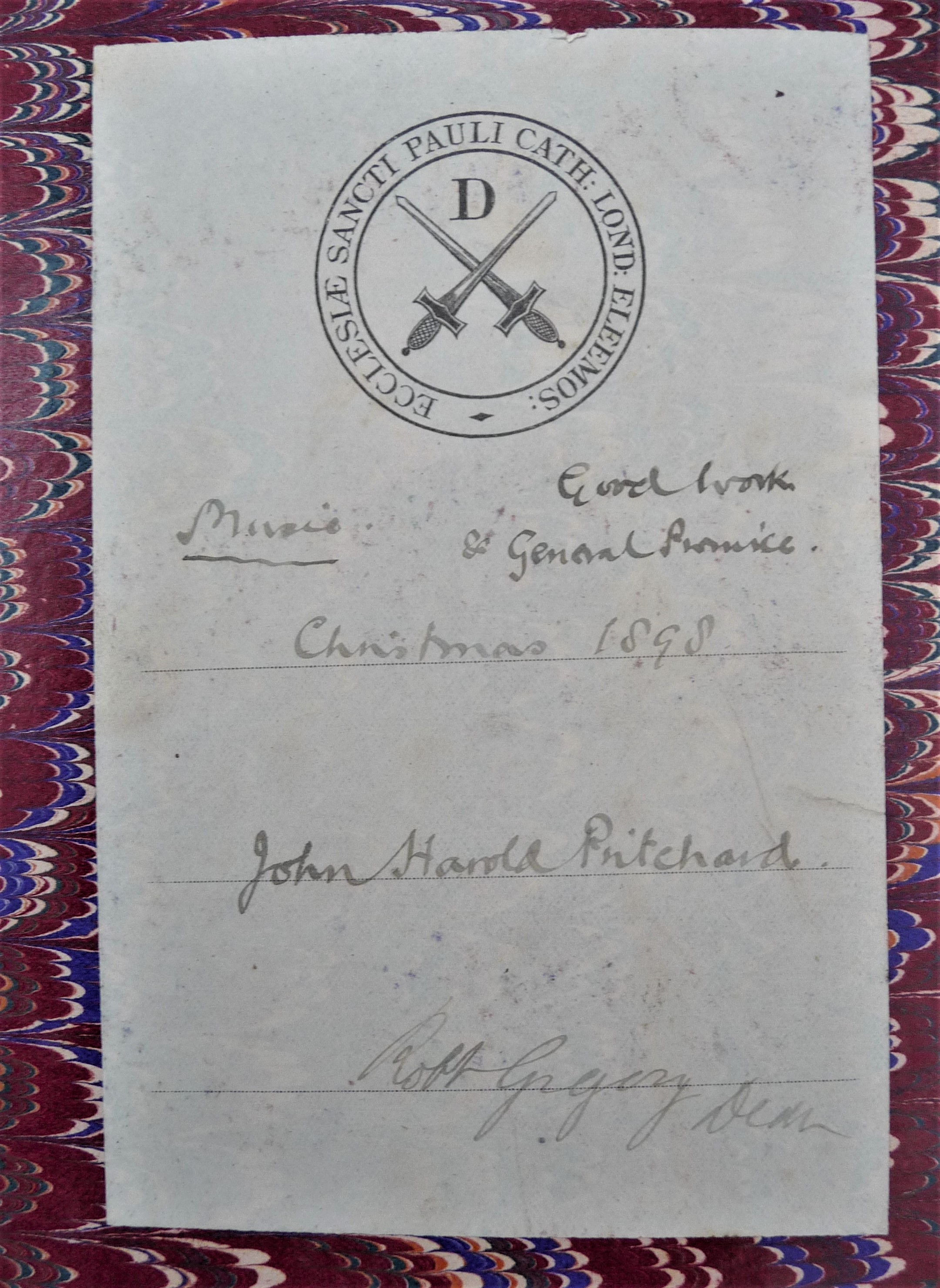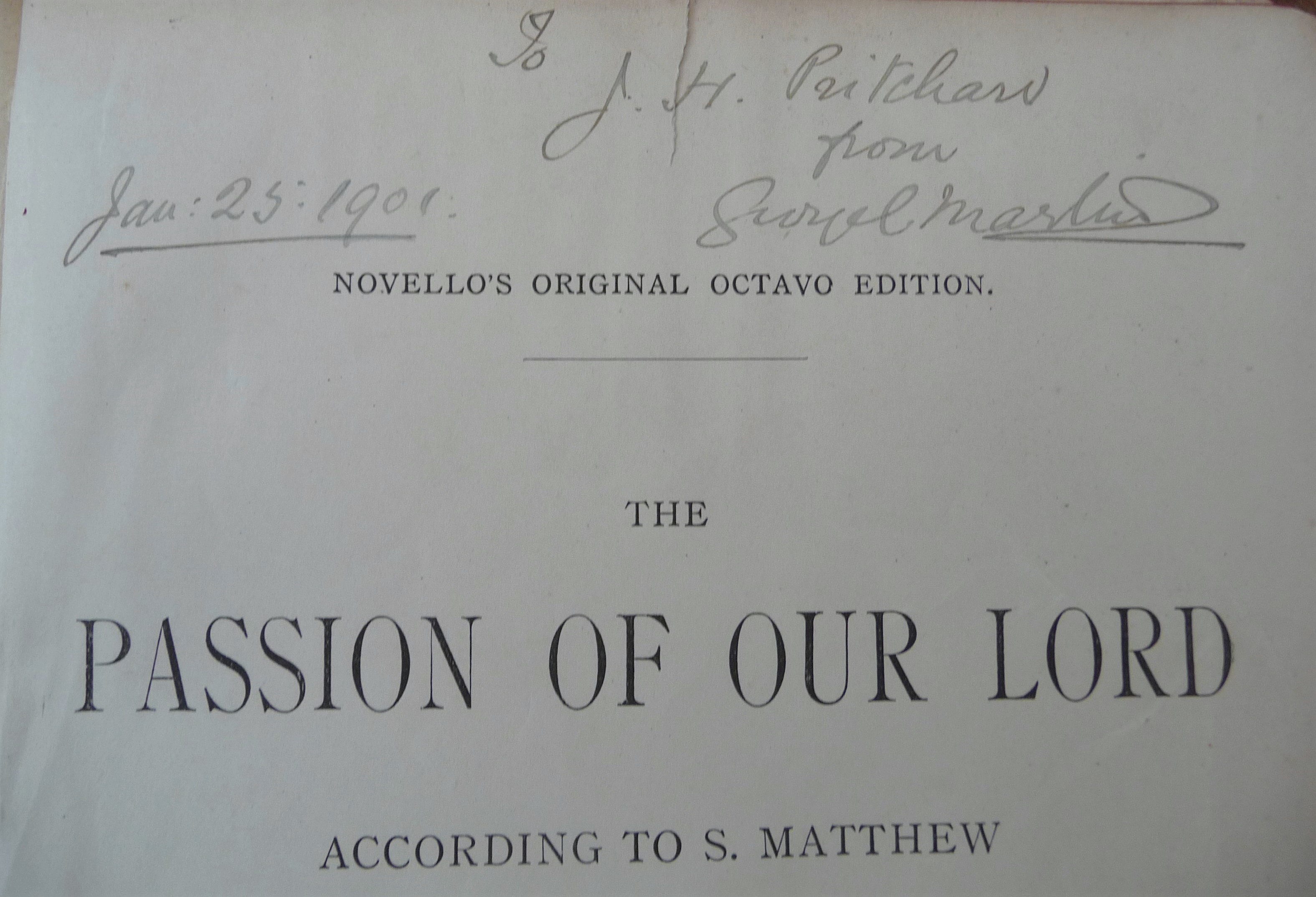 Along with many other boys I am sure, John was soon awarded prizes for good conduct and music! The oldest one is for good work and general promise given at Christmas 1898! The organist and choir master at the time was George Clement Martin who had taken over from John Stainer and we have a copy of the St Matthew Passion given to John on 25th January 1901, signed by George Martin.